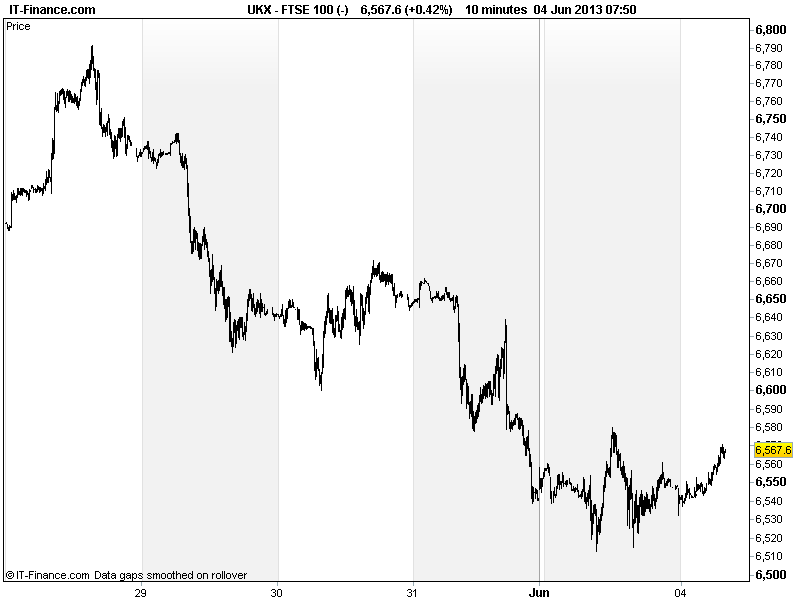 UK 100 called to open +40pts at 6570 after positive US close and bullish handover to Asia, helped by – wait for it – poor US data (ISM Manufacturing in contraction) reducing recently heightened fears the US Fed could taper its QE3 asset purchase programme soon, seeing the USD sell-off further and helping commodities.