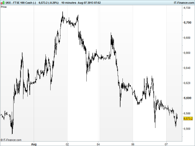 UK 100 called to open -10pts at 6575, (but ex-divs taking off 14pts so index essentially flat), with Asian markets in the red again, following on from weak European and US sessions as tapering fears gather pace anew with Fed members Evans and Lockhart both raising the possibility of September although the former did say that he ‘couldn’t be sure which month’ and a narrower US trade deficit. The BoJ announced no new easing measures, seeing the JPY hit a 6-week high vs. USD and Japan’s Nikkei fall below 14000.