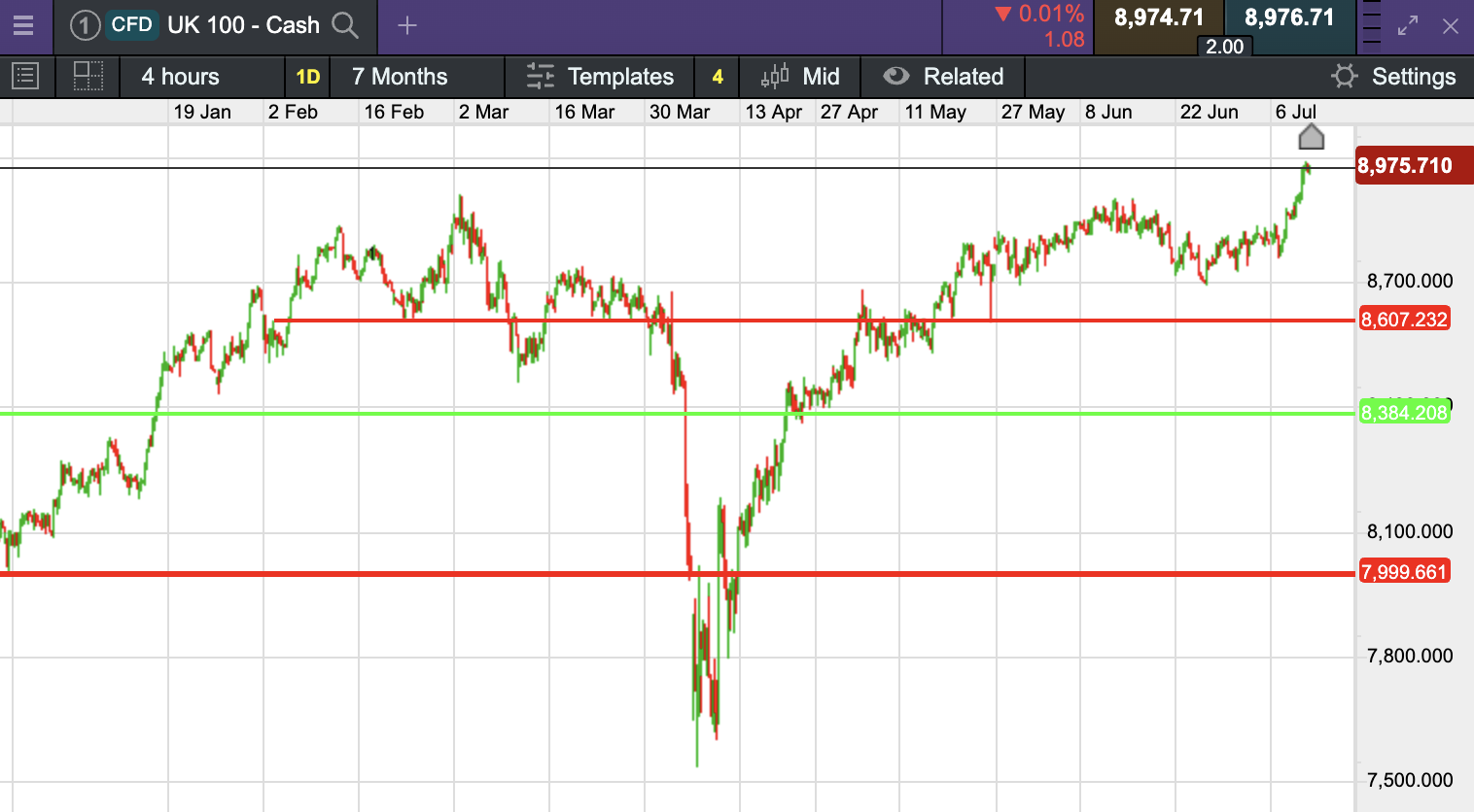 The UK 100 called to open flat this morning at 8,975. The UK 100 looks set to open broadly flat this morning having closed at fresh record highs on Thursday. Data out this morning from the office of national statistics showed that the UK economy had shrunk for a 2nd consecutive month, interacting 0.1% in May.