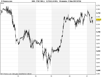In FX, the GBP/USD has weakened overnight on the prospect as the USD on Bernanke’s lack of colour on more asset purchases and prospect of 2013 being a good year if the fiscal cliff is resolved (something we all expect, eventually). EUR/USD made a similar moves, but helped also by a weakening in the EUR on a lack of overnight progress. In commodities, Gold maintains its pull-back from $1735 highs as the commodity currency (USD) strengthens. Brent still supported by Middle Eastern unrest leading to fears of supply disruption. Rising lows from $104 through $109, resistance at 3-day highs of $112. US Light Crude in middle of $85-90 range.