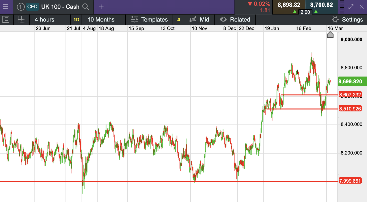 The UK 100 called to open -5 points at 8,700. The UK 100 looks set to open marginally lower this morning, having bucked the trend yesterday for global markets, the UK’s bluechip index closed higher continuing its positive end to last week.