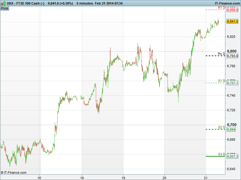 UK 100 called to open + 45 at 6848 following the lead from the Asian markets despite mixed macro-data from the US where Markit PMI beat expectations but Philly Fed disappointed due to the cold weather.  The Nikkei recouped yesterday losses and was higher by 2.9% as the Yen weakened, whilst the Hang Seng and ASX were both higher by 0.5%. US equity markets edged higher with the DOW up 92 points at 16133 in a trading session that saw almost a 200 point range.