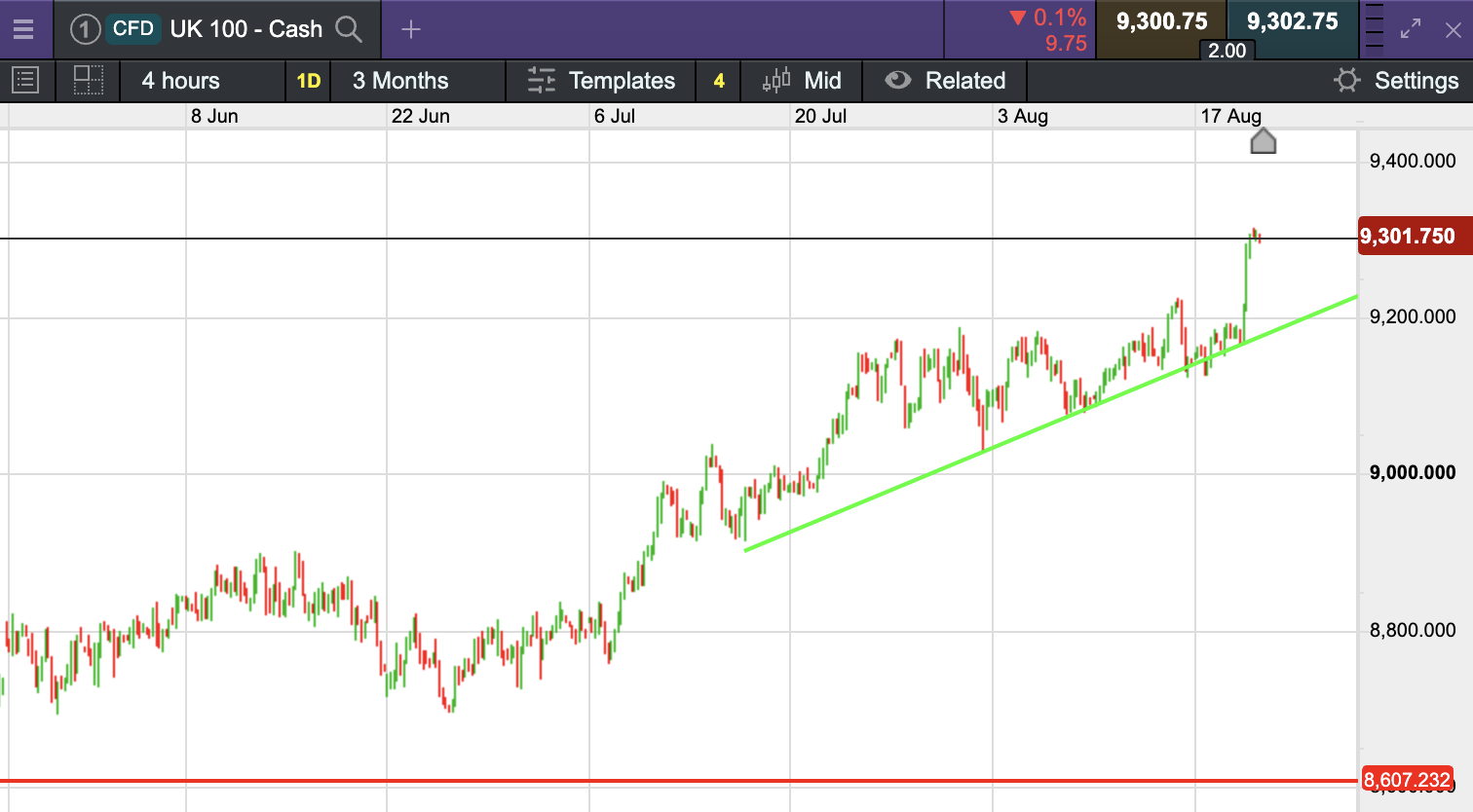 The UK 100 called to open +17 points this morning at 9,305. The UK 100 is called to open slightly higher on Thursday, ahead of the UK’s public sector net borrowing data. The UK’s blue-chip index looks set to break the 9300 barrier for the first time, having closed above 9200 yesterday to set a fresh all time closing high.