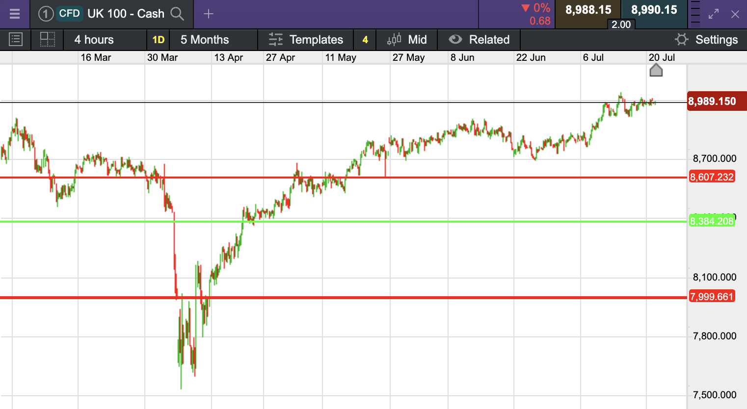 The UK 100 called to open -22 points this morning at 8,990. The UK 100 looks set to open slightly lower this morning, matching expected similar declines across other European markets.  Data out this morning showed that UK public sector net borrowing rose more than expected in June, raising to £20.7 Billion from a previous read of £17.7 Billion in May.