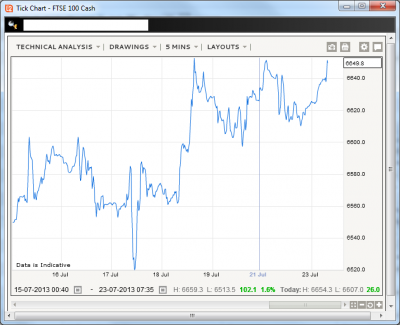 UK Index called up 27 points this morning following a muted trading session yesterday in Europe. The US however, extended its recording and closed higher. This was despite a round of mediocre earnings, MacDonald’s being a big disappointment. However financials and health care stocks led the way. The Dow Jones, S&P 500 and Nasdaq all bounced back – The S&P 500 registering yet another all-time high at 1669.4pts. Miners gained on gold prices surging which helped the indices. After the bell Netflix shares fell 6.1% in after-hours trading after it reported a profit for the second quarter but added fewer subscribers to its video streaming service than analysts expected.