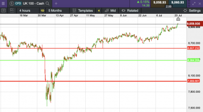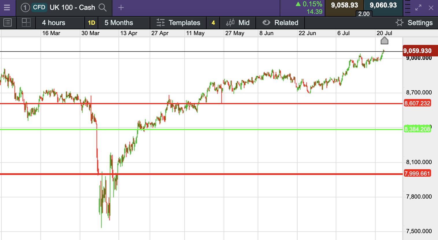 The UK 100 called to open +36 points this morning at 9.059. The UK 100 looks set to open higher again this morning after stock market sentiment was boosted by Japan’s trade deal with the US.