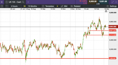 The UK 100 called to open +36 points at 8,682.  The UK 100 looks set to open higher this morning, gaining traction from Fridays late rally.  Signs that President Trump’s next round of tariffs may be targeted than previously suggested and hopes that a Russia/Ukrainian truce can be agreed upon by the 20th April have also added to the positive sentiment this morning.