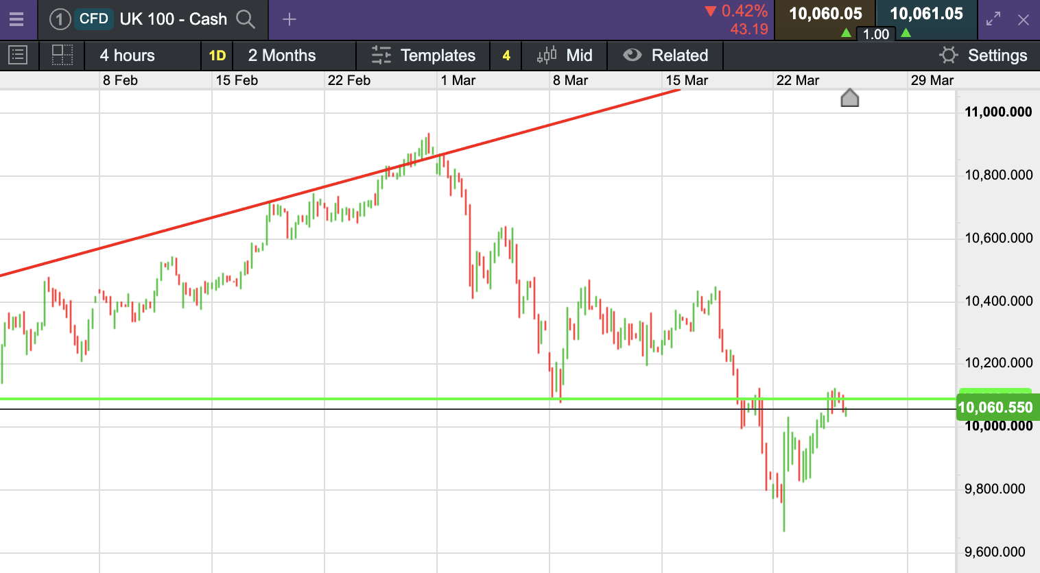The UK 100 is called to open -50 points at at 10,056. The UK 100 looks set to open slightly softer today, this follows a 140+ point rise for the UK’s blue-chip index yesterday.