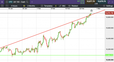 The UK 100 is called to open +37 points at 10,883. The UK 100 looks set to open at a fresh record high this morning, having closed again yesterday at an all time closing high, the 21st this year for the UK’s bluechip index.