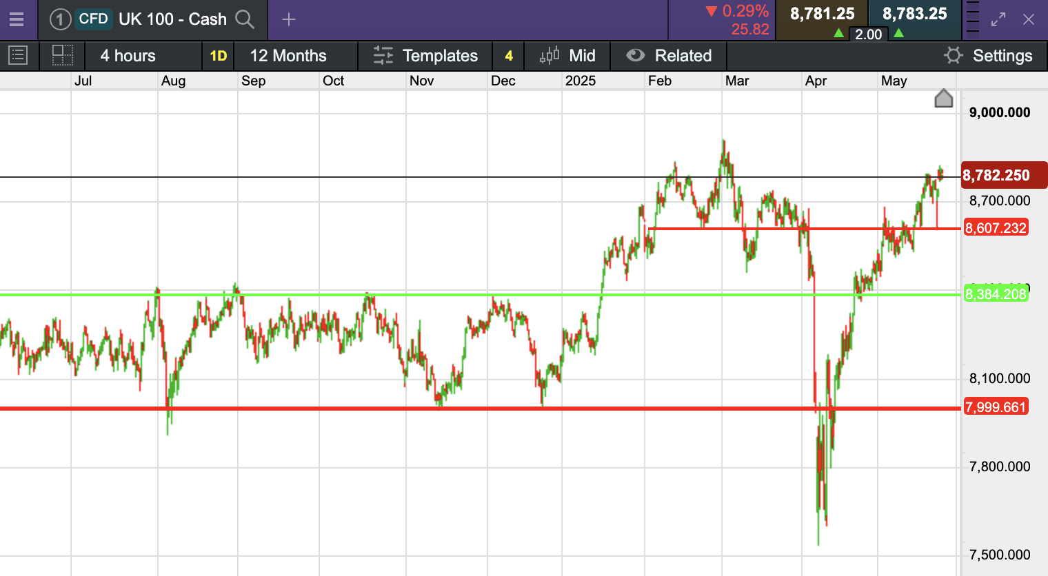 The UK 100 called to open +5 points this morning at 8,783. The UK 100 looks set to open higher today, following a positive performance in Asian markets and Wall Street’s rebound. The UK’s blue chip index gained 0.7% on Tuesday, closing at 8,680.29 points. This uptick was driven by investor optimism after U.S. President Donald Trump delayed tariffs on European Union imports, boosting investor sentiment across global markets.