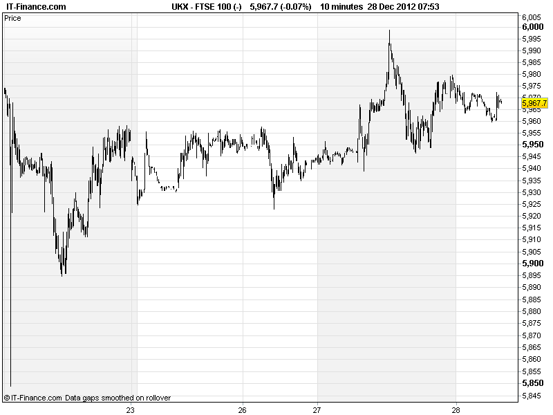 UK 100 futures had a good go at the 6000 figure yesterday but when the sun was at its highest the index peaked and began to fall back, almost suggesting it knew that US Jobless would remain static, US Consumer confidence would plummet on fiscal cliff fears and New Home Sales would just miss expectations. Nonetheless, the index maintains its trendline of rising support at 5690. So another attempt is not to be ruled out before the New year festivities.