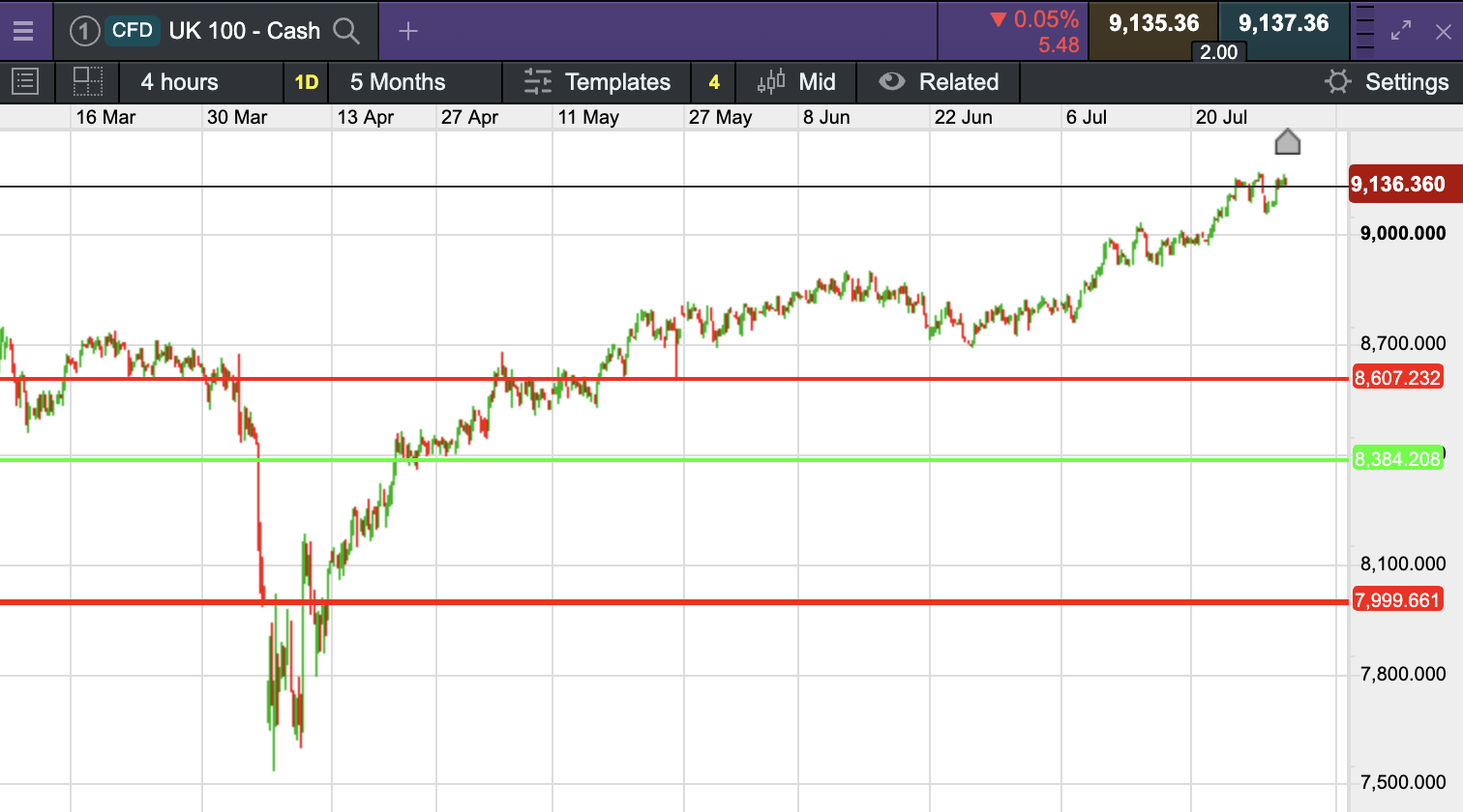 The UK 100 called to open +4 points this morning at 9,140. The UK 100 looks set to test all time highs once again at the open, this comes after the UK’s bluechip index struck an all time high yesterday.