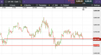 The UK 100 called to open -64 points this morning at 8,592. The UK 100 looks set to start the week with a sharp fall ahead of Donald Trump’s big tariff day, as proven by gold simultaneously surging to new highs.