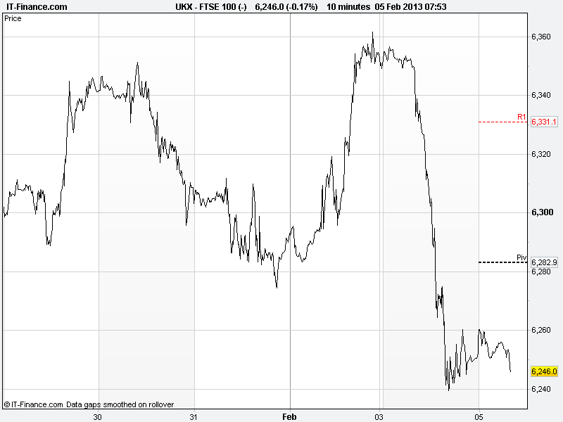 UK 100 futures found support at 6250 overnight after yesterday’s declines. European, and especially political factors rearing their ugly head after period of extreme quiet have served as reason of choice to counter growing bullishness since mid-November and early January when the US averted its fiscal cliff.