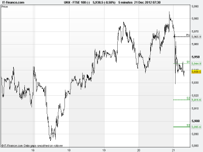 UK 100 called to open -25pts, with Asian markets lower after news late last night that US House Speaker Boehner has seen his Plan B ‘stunt’ to limit the tax hikes of the US Fiscal Cliff fail to gain enough support to pass a vote even from his own Republicans in the lower House of Representatives, adding to Democrats’ clear objection and expected failure in the upper House (Senate).