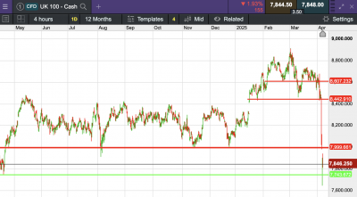 The UK 100 called to open -224 points this morning at 7,830. The UK 100 looks set to significantly lower once again this morning, as the global fallout from Trump tariffs continued overnight.