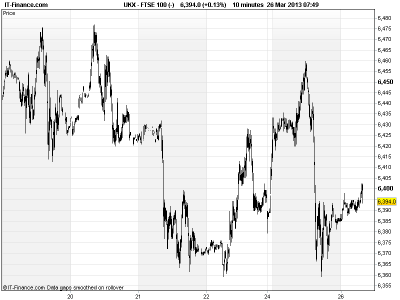 UK 100 called to open +10pts, finding a modicum of support following game-changing comments from the head of the Eurogroup of Finance Ministers Jeroen Dijsselbloem (followed by back-tracking) that, while Cyprus was a unique case, the rescue package involving a bail-in of uninsured (<€100K) bank depositors represents template for future bailouts.