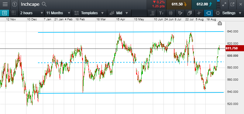 Will Inchcape break the resistance line at 612p (currently at 611.5p at time of writing), or will it fall back to the bottom of the range at 560p? (-8.5%)