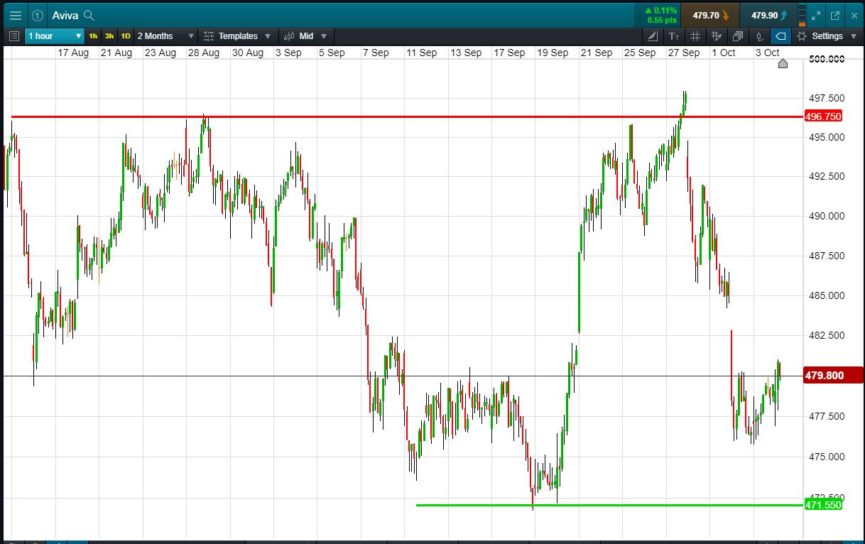 Let’s say you like the range, you think it’s heading back towards 496p again. You decide to buy exposure to £10,000 worth of Aviva using a CFD, at the current price of 480p. To do this, you need £2,000.