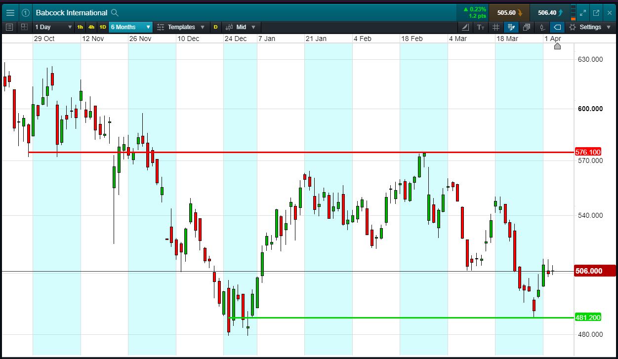 Let’s say you like the range, you think it’s heading back towards 576p again. You decide to buy exposure to £10,000 worth of Babcock using a CFD, at the current price of 506p. To do this, you need £2,000.