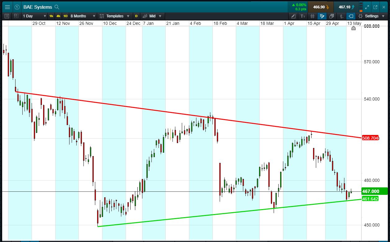 Let’s say you like the range, you think it’s heading back towards 508p again. You decide to buy exposure to £10,000 worth of BAE Systems using a CFD, at the current price of 467p. To do this, you need £2,000.