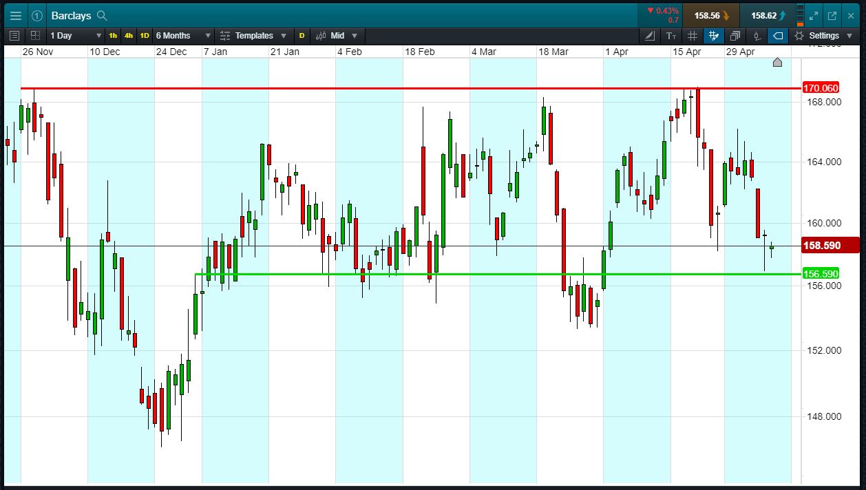 Let’s say you like the range, you think it’s heading back towards 170p again. You decide to buy exposure to £10,000 worth of Barclays using a CFD, at the current price of 158p. To do this, you need £2,000.