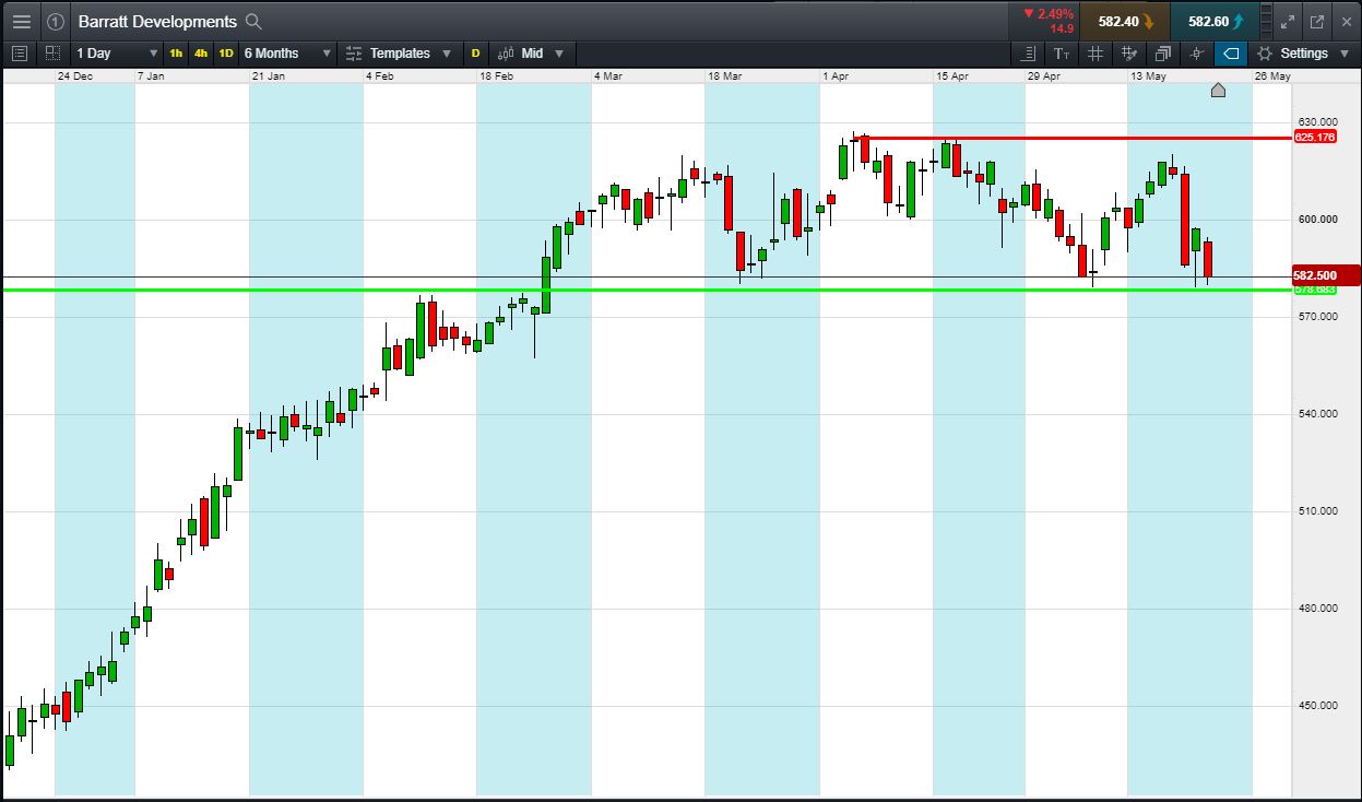 Let’s say you like the range, you think it’s heading back towards 623p again. You decide to buy exposure to £10,000 worth of Barratt Developments using a CFD, at the current price of 590p. To do this, you need £2,000.