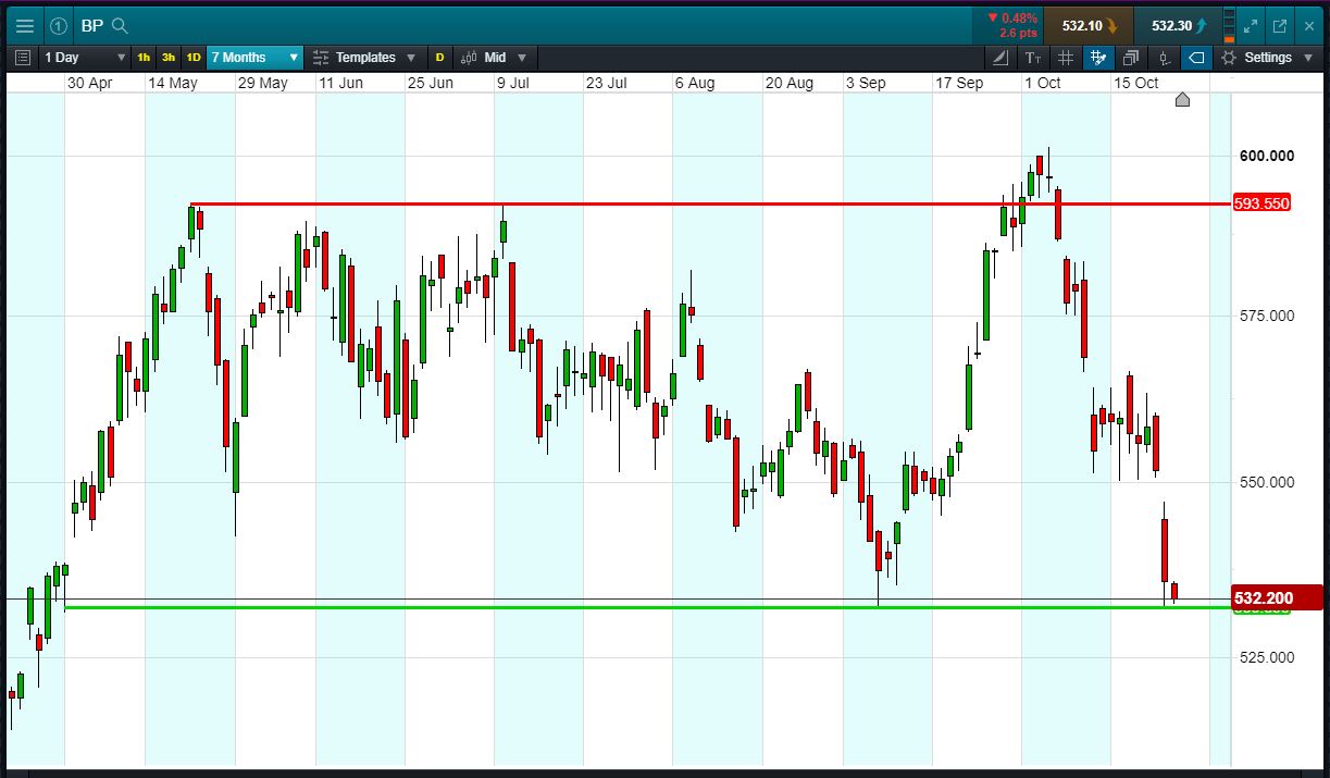 Let’s say you like the range, you think it’s heading back towards 594p again. You decide to buy exposure to £10,000 worth of BP using a CFD, at the current price of 532p. To do this, you need £2,000.