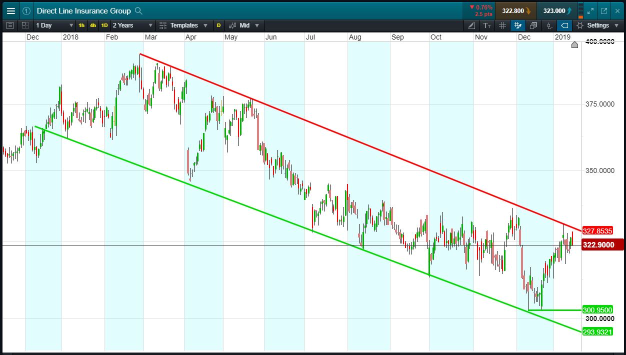 Will Direct Line break higher, or will it fall to 301p lows again?