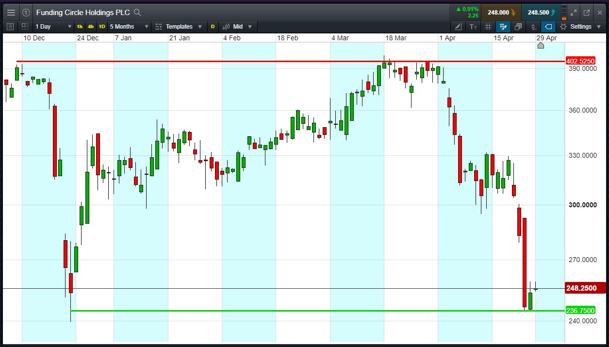 Let’s say you like the range, you think it’s heading back towards 402p again. You decide to buy exposure to £10,000 worth of Funding Circle using a CFD, at the current price of 248p. To do this, you need £2,000.