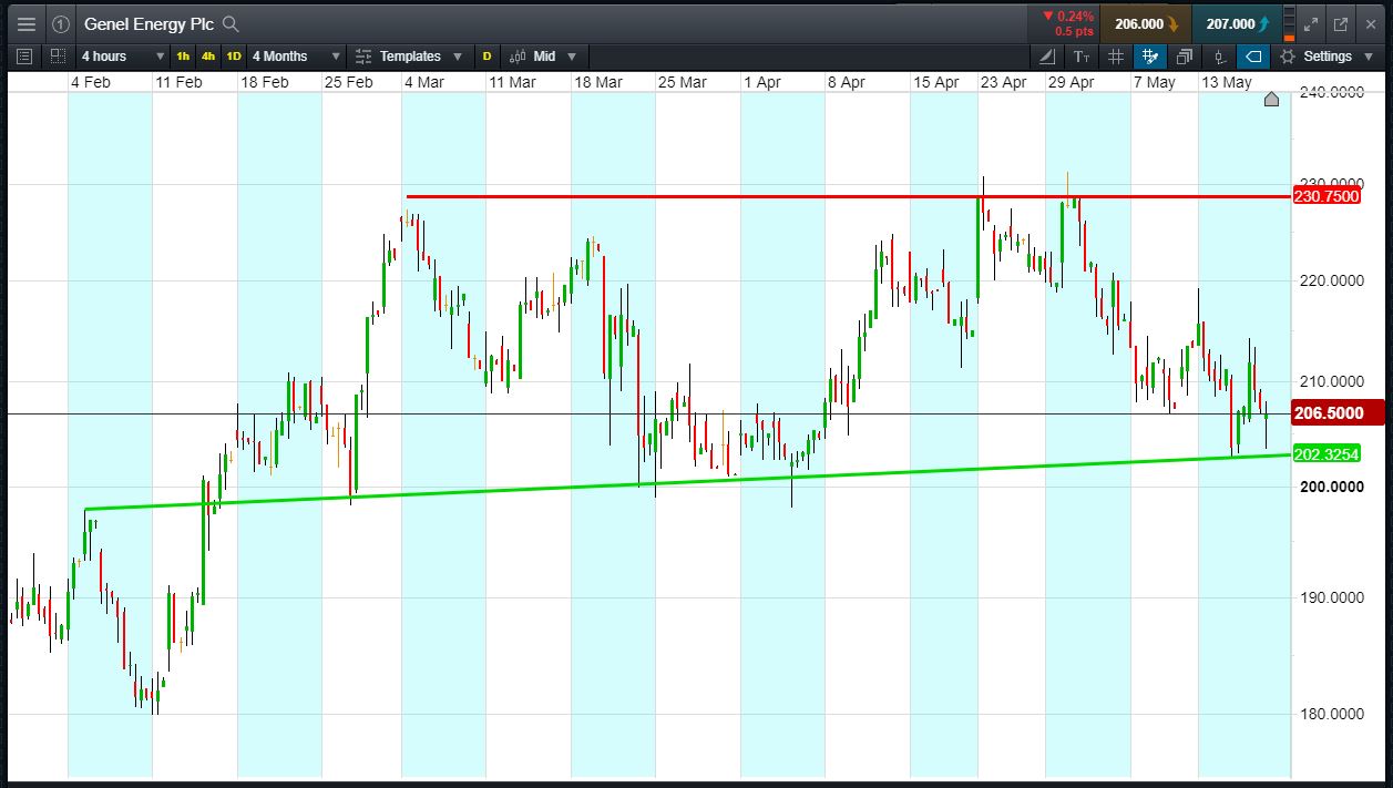 Let’s say you like the range, you think it’s heading back towards 230p again. You decide to buy exposure to £10,000 worth of Genel Energy using a CFD, at the current price of 206p. To do this, you need £2,000.