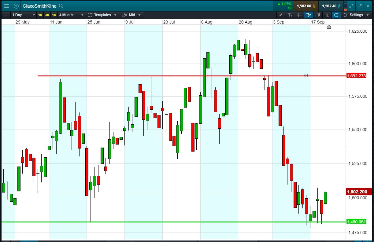 Will GlaxoSmithKline break support, or will it rise again back to 1592p?