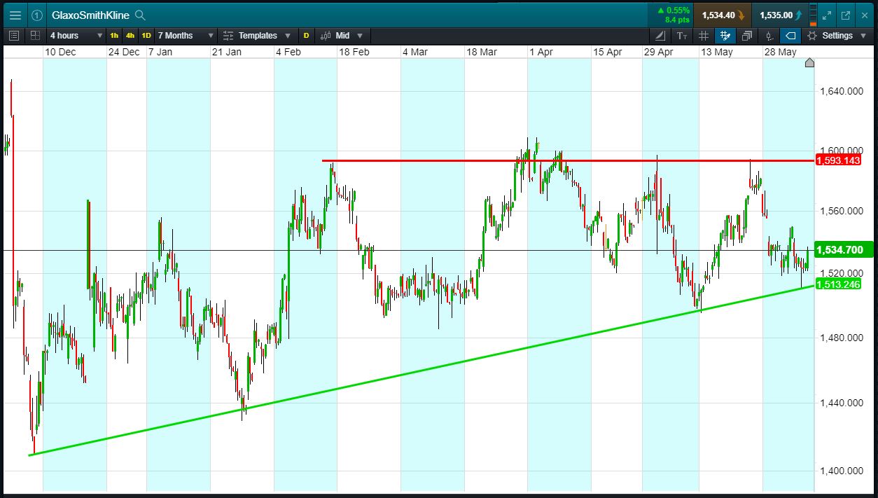 Will GlaxoSmithKline break resistance, or will it rise back to 1593p?