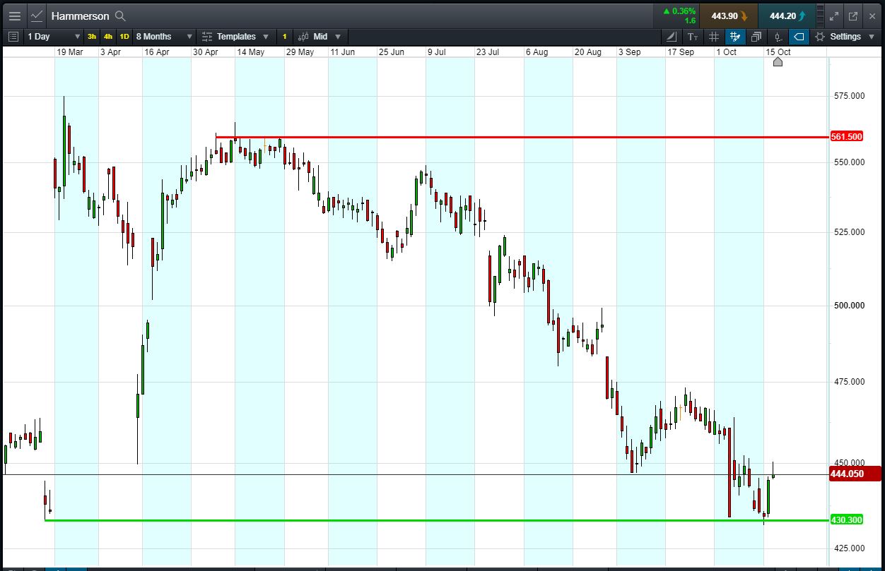 Let’s say you like the Hammerson range, you think it’s heading back towards 561p again. You decide to buy exposure to £10,000 worth of Hammerson using a CFD, at the current price of 444p. To do this, you need £2,000.