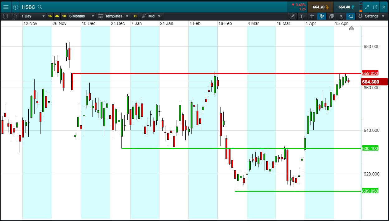 Let’s say you like the range, you think it’s heading back towards 630p again. You decide to sell exposure to £10,000 worth of HSBC using a CFD, at the current price of 664p. To do this, you need £2,000.