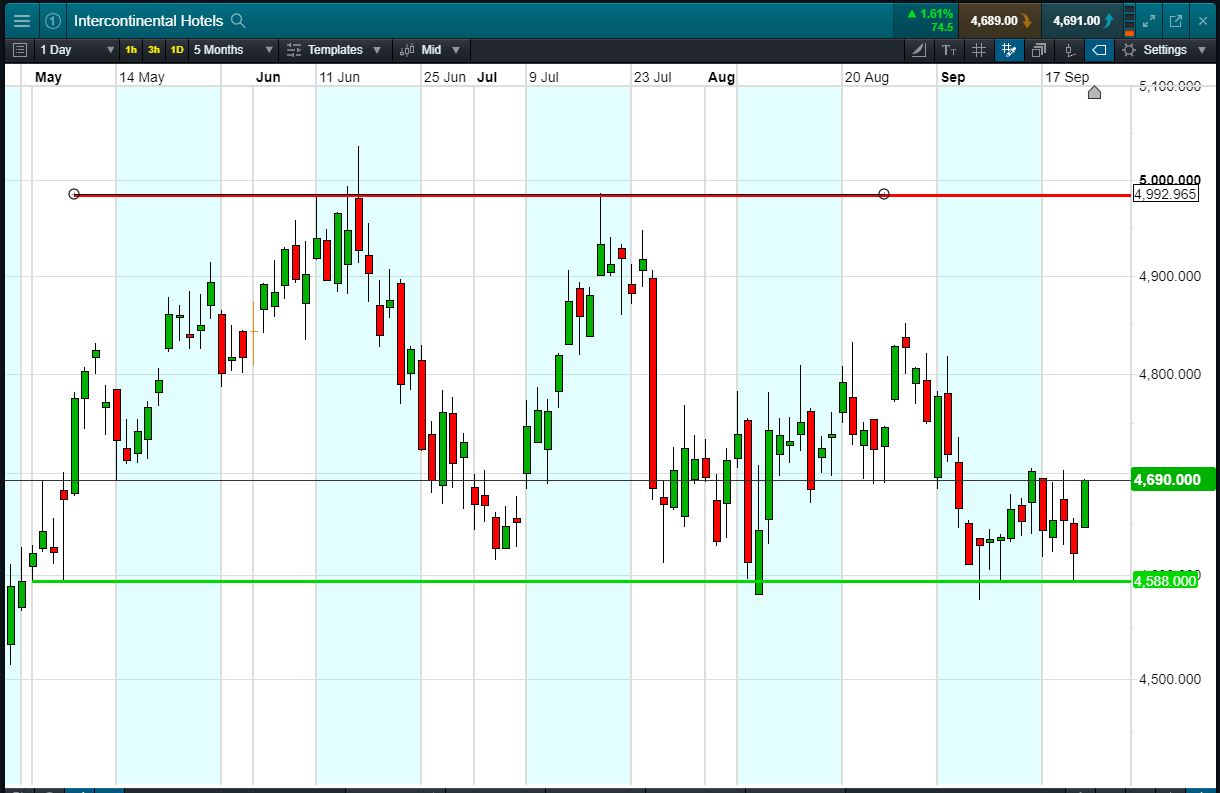 Let’s say you like the range, you think it’s heading back towards 4993p again. You decide to buy exposure to £10,000 worth of InterContinental using a CFD, at the current price of 4695p. To do this, you need £2,000.
