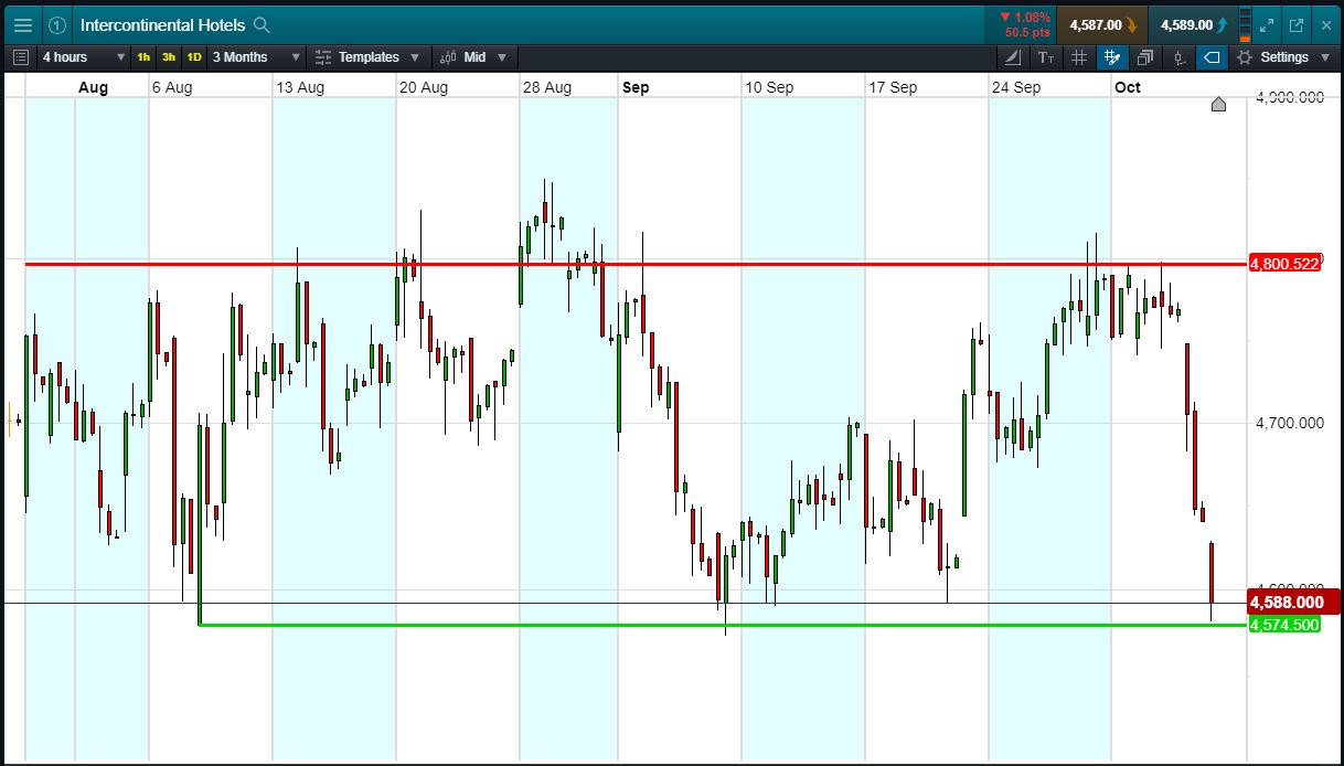 Let’s say you like the range, you think it’s heading back towards 4800p again. You decide to buy exposure to £10,000 worth of InterContinental using a CFD, at the current price of 4588p. To do this, you need £2,000.