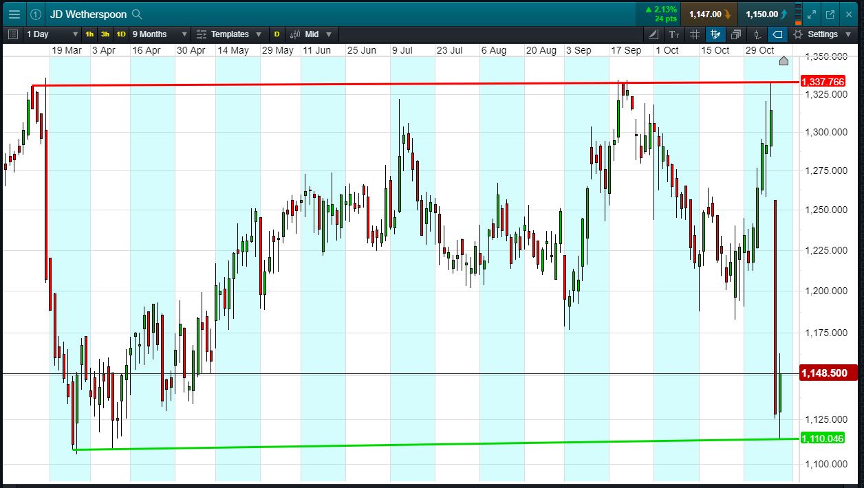- The Wetherspoons trading range (1110-1337p) has developed since March.