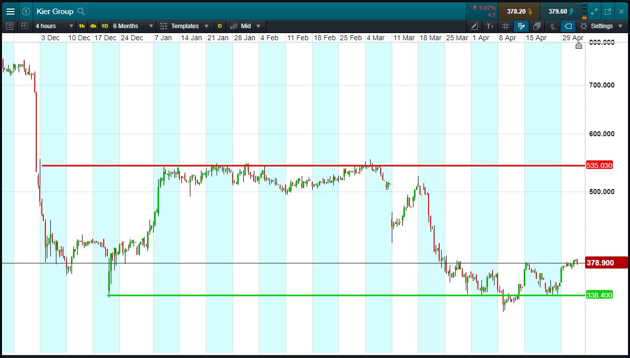 Let’s say you like the range, you think it’s heading back towards 535p again. You decide to buy exposure to £10,000 worth of Kier using a CFD, at the current price of 378p. To do this, you need £2,000.
