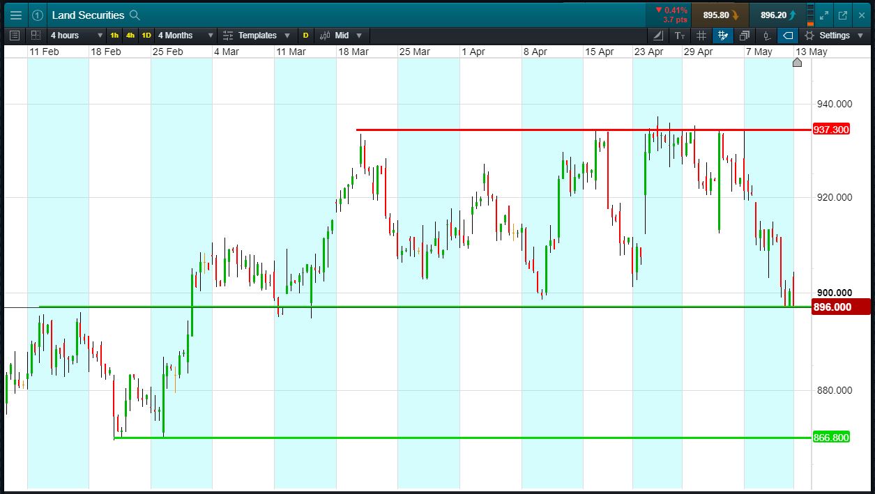 Let’s say you like the range, you think it’s heading back up towards 937p again. You decide to buy exposure to £10,000 worth of Land Securities using a CFD, at the current price of 896p. To do this, you need £2,000.