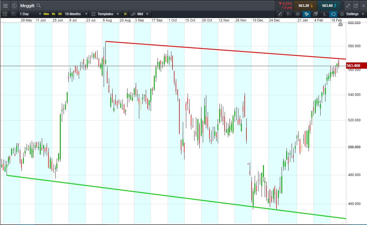 Let’s say you like the range, you think it’s heading back towards 455p again. You decide to sell exposure to £10,000 worth of Meggitt using a CFD, at the current price of 563p. To do this, you need £2,000.