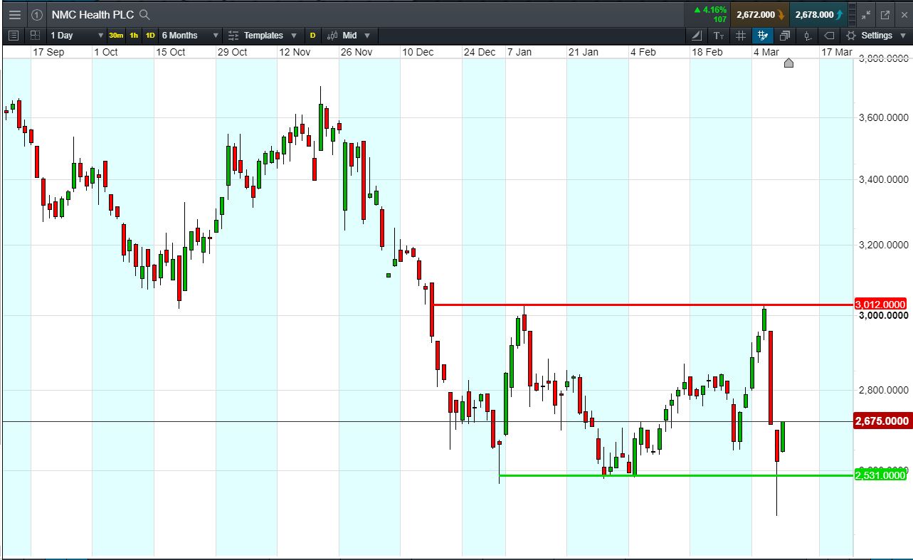 Let’s say you like the range, you think it’s heading back towards 3012p again. You decide to buy exposure to £10,000 worth of NMC Health using a CFD, at the current price of 2675p. To do this, you need £2,000.