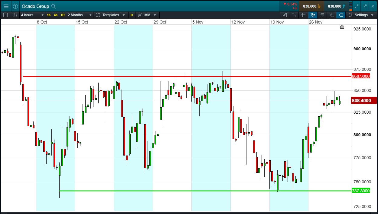 - Ocado shares are trading in 737-868p range since early October.