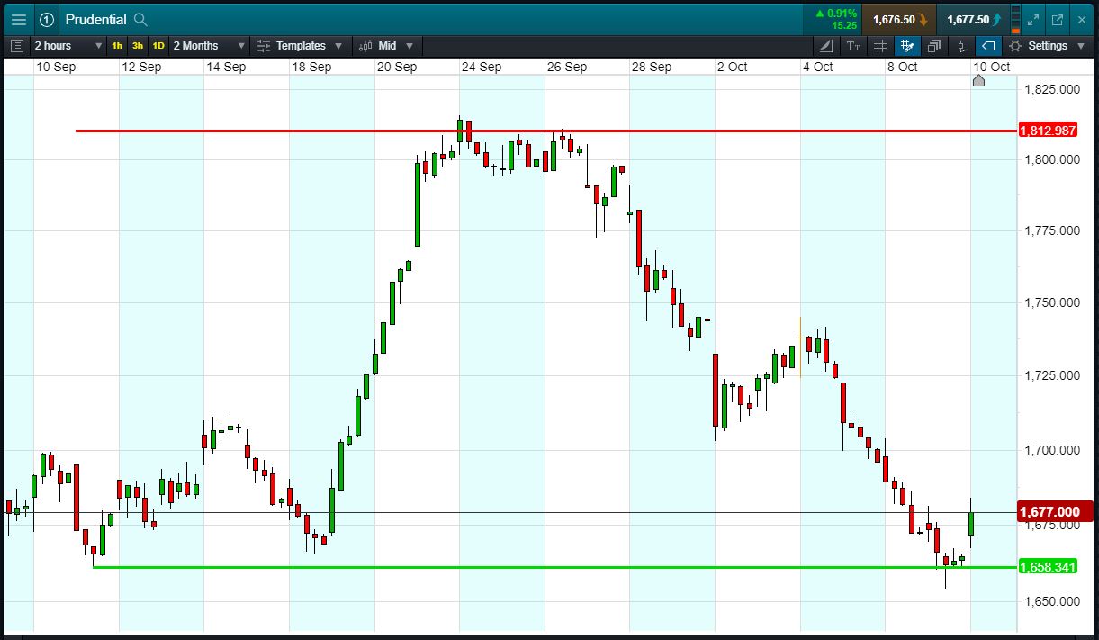 Let’s say you like the range, you think it’s heading back towards 1813p again. You decide to buy exposure to £10,000 worth of Prudential using a CFD, at the current price of 1677p. To do this, you need £2,000.