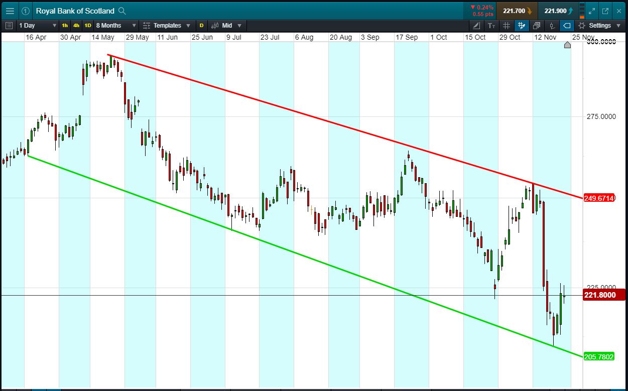 Let’s say you like the RBS range, you think it’s heading back towards 250p again. You decide to buy exposure to £10,000 worth of RBS using a CFD, at the current price of 222p. To do this, you need £2,000.