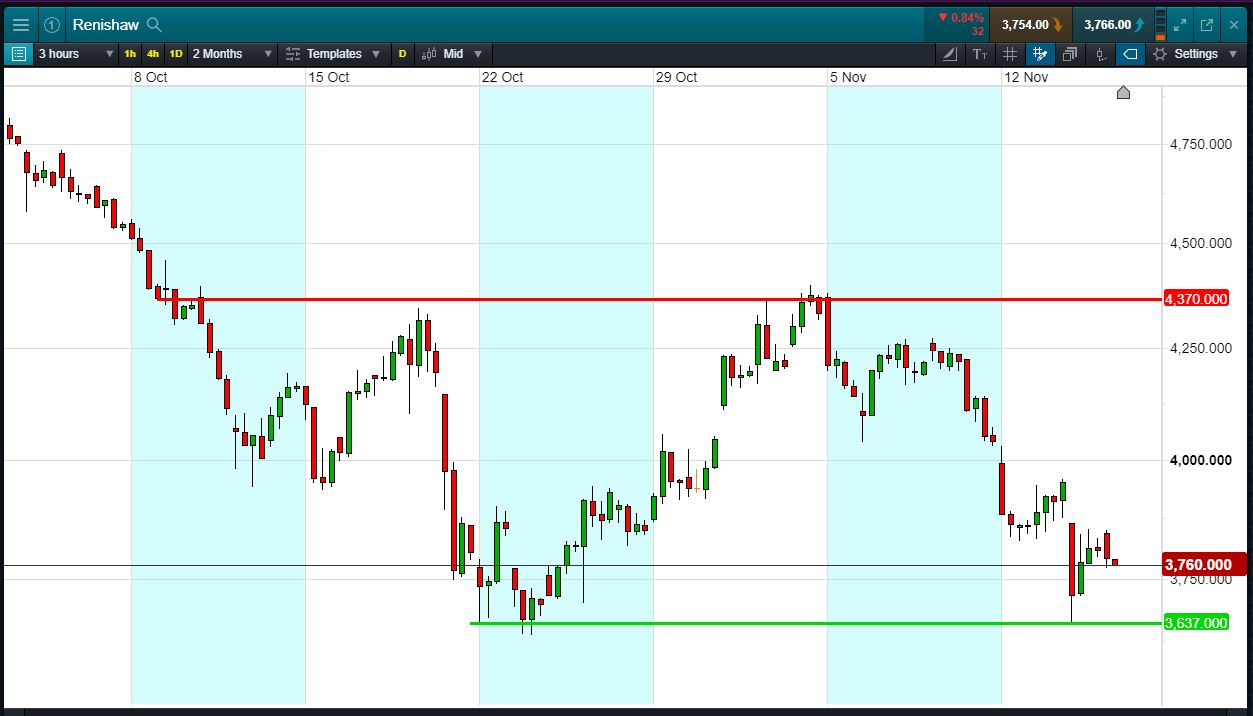 - Renishaw shares are trading in 3637-4370p range since mid-October.