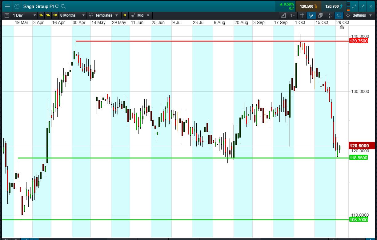 Let’s say you like the Saga range, you think it’s heading back towards 139p again. You decide to buy exposure to £10,000 worth of Saga using a CFD, at the current price of 120p. To do this, you need £2,000.
