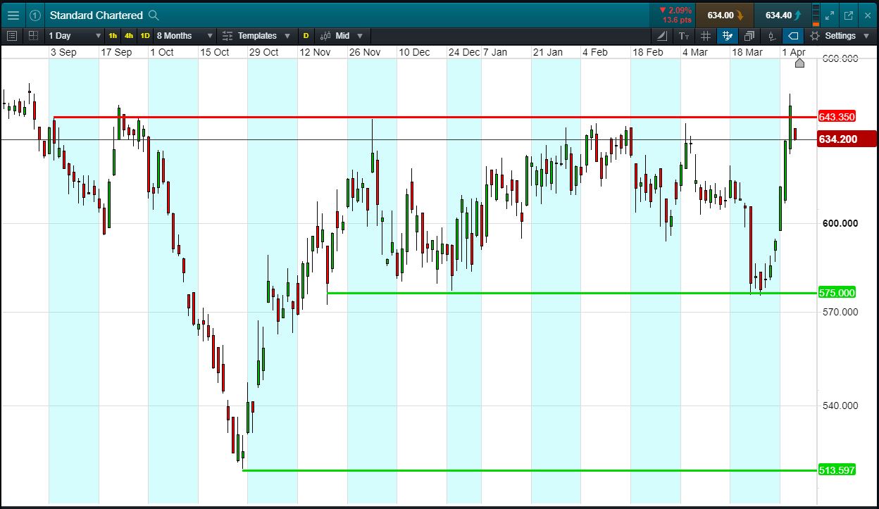 Will Standard Chartered break resistance, or will it fall back to 575p?