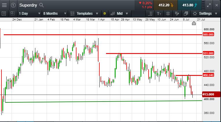 Will Superdry break support, or will it rise again to April highs of 470p (+12%)?