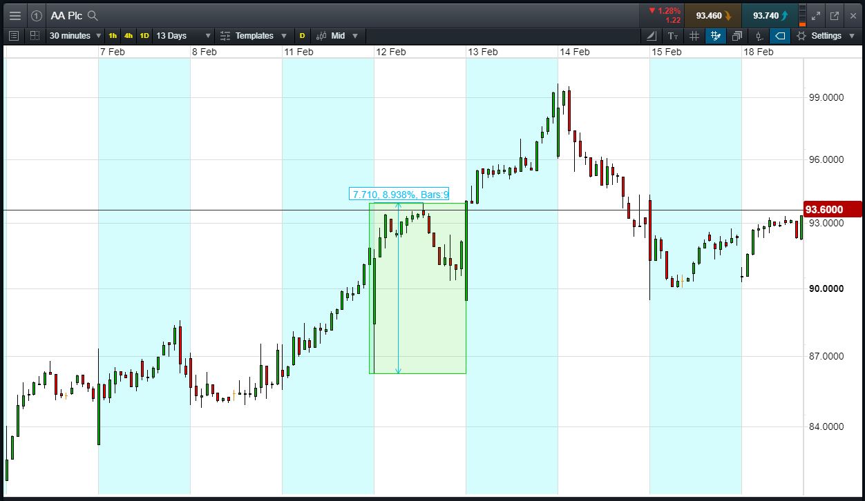Let’s say you think that AA results are likely to be good, and the share price is likely to rise. You decide to buy exposure to £10,000 worth of AA using CFDs, at the current price of 93.5p. To do this, you need £2,000.